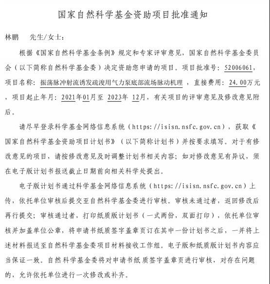 我院林鹏博士喜获2020年度国家自然科学青年科学基金项目立项资助