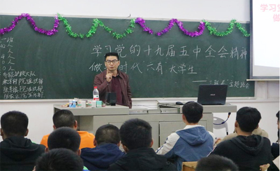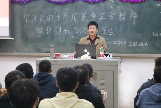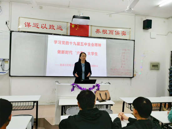 为深入学习贯彻党的第十九届五中全会精神,增强“四个意识”、坚定“四个自信”,激励同学们担当作为,奋发进取,把思想和行动统一到五中全会重大决策部署上来,2020年11月11日,能源与机电工程学院团总支召开了“学习党的十九届五中全会精神,做新时代‘六有’大学生”三联系主题班会。校党委委员、宣传统战部部长谢柳,校地校企合作处处长黎建辉、副处长周卫军,创新与创业学院副院长刘盛愚,能源与机电工程学院党总支书记彭辉、院长谢常清、副书记伍铁斌,2020级各班班主任老师、全体辅导员、学生干部代表等分别到相应“三联系”班级进行了指导。