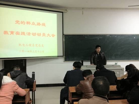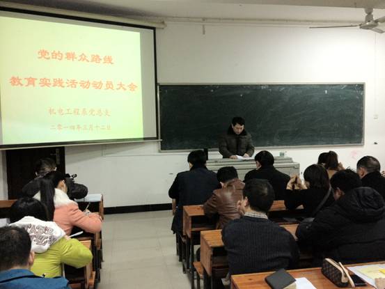 2014年3月12日晚,机电工程系在学而楼309教室召开了党的群众路线教育实践活动动员大会,校长刘和云出席并作重要讲话,学校第五督导组、机电系全体教师、学生党员及学生代表参加了大会。