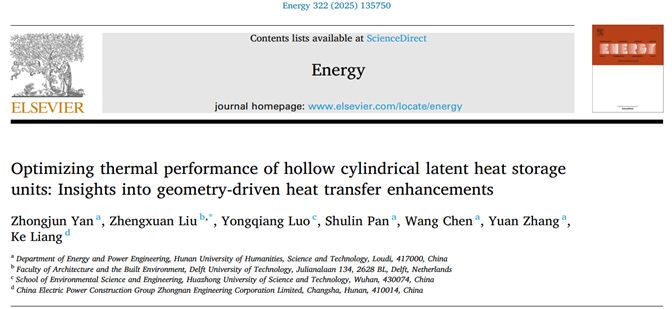 近日,贝博能源与机电工程学院能源与动力工程专任教师严中俊博士以第一作者在工程技术Top期刊《Energy》(中科院一区,IF:9.0)发表题为“Optimizing thermal performance of hollow cylindrical latent heat storage units: Insights into geometry-driven heat transfer enhancements”的研究文章,荷兰代尔夫特理工大学刘政轩博士为通讯作者,华中科技大学罗勇强副教授为共同作者。