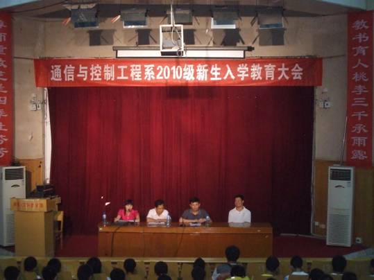 2010年9月15日晚,通信与控制工程系2010级新生入学教育大会在匠成楼报告厅举行。大会由系党总支副书记刘宗良主持,系党总支书记谭甲凡、系副主任田汉平、谢四莲和新生班主任出席了大会。
