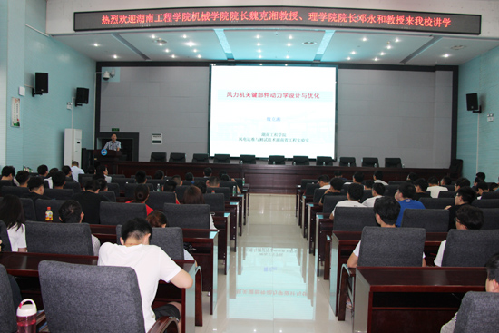 6月15日,湖南工程学院机械工程学院院长魏克湘教授应邀做客“人文科技大讲坛”,在图书馆第二会议室为学院师生带来了一场题为“风力机关键部件动力学设计与优化”专题讲座。本次讲座由能源与机电工程学院院长谢常清、副院长胡东主持,报告会吸引了能机院160余名师生参加。