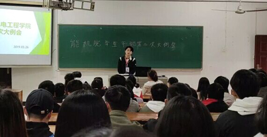 3月26号下午16点, 能源与机电工程学院在学而楼209召开了全院学生干部大会(学生会干部,各班的班长与团支书), 参加会议的有彭辉书记, 伍铁斌副书记, 辅导员肖毅老师, 曾增日老师和王霞光老师, 会议由伍铁斌副书记主持, 首先由伍铁斌副书记传达了3月22号学工处主办的审核评估工作布置会上刘校长,红燃处长, 陈勇处长等的重要讲话精神, 并对各位学生干部提出了具体的要求. 然后由学生会各部门的部长做了开学以来的工作总结, 以及下一阶段的安排。(图、文 肖毅)