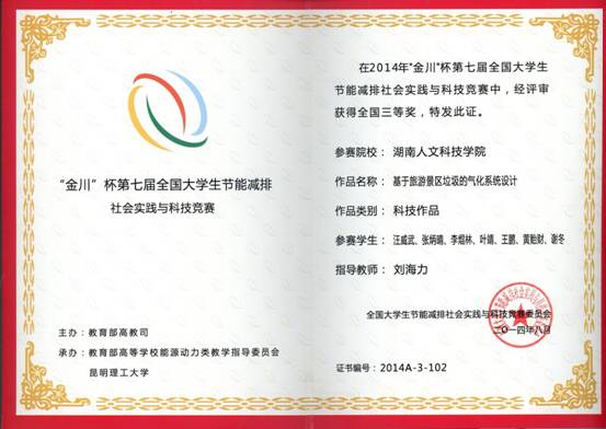 在昆明理工大学举行的“金川”杯全国第七届节能减排社会实践与科技竞赛中,贝博能源与机电工程系能源与动力工程专业刘海力老师指导汪威武等同学设计的《基于旅游景区垃圾的气化系统设计》项目获得全国三等奖。