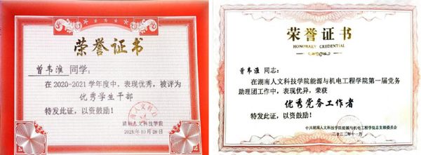 大学四年,曾韦淮一直活跃在学生干部的群体之中,从团支部书记到党支部副书记,从团总支干事到副书记,每一步都印证了他的成长。他很感谢班级、党支部以及学院对他的信任,用心做好交付的每一件工作。在为师生服务的路途上他坚定信仰,以青春之我,创建青春之家庭,青春之国家,青春之民族,将自己的力量汇聚到民族复兴的伟大洪流之中。