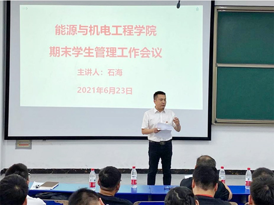 6月23日,能源与机电工程学院在致远楼102召开2021年上学期期末学生管理工作暨学风建设推进会议,院党总支书记谢常清教授、党总支副书记石海、副院长伍铁斌教授,全体辅导员,2018-2020级各班班长、团支书、学习委员,院学生会全体干部参会,会议由石海主持。