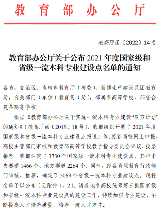 近日,教育部办公厅下发了《关于公布2021年度国家级和省级一流本科专业建设点名单的通知》(教高厅函[2022]14号),我院材料成型及控制工程专业入选国家级一流本科专业建设点。