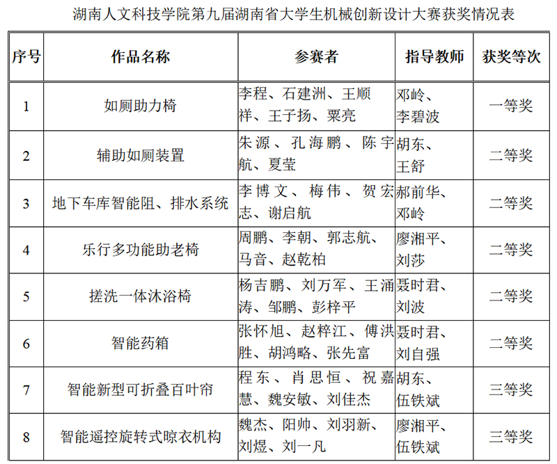 红网时刻娄底9月30日讯(通讯员 邓岭)9月26日至27日,第九届湖南省大学生机械创新设计大赛在邵阳学院举行。本次大赛主题为“智慧家居、幸福家庭”,共有来自国防科技大学、中南大学、湖南大学等33所高校的253件作品参赛。ballbet贝博bb艾弗森能源与机电工程学院共有8项参赛作品获奖:一等奖1项、二等奖5项、三等奖2项,其中由邓岭老师、李碧波老师指导的作品《如厕助力椅》获得一等奖,将代表湖南省参加全国大学生机械创新设计大赛。