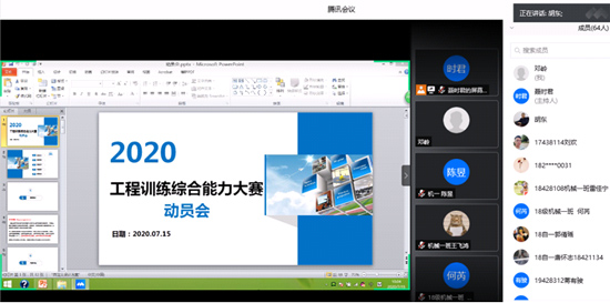 7月15日上午10点,能源与机电工程学院通过腾讯会议进行线上2020年工程训练综合能力竞赛动员会。能源与机电工程学院领导、机械专业指导老师和学生共70余人参加了本次会议,会议由聂时君老师主持。