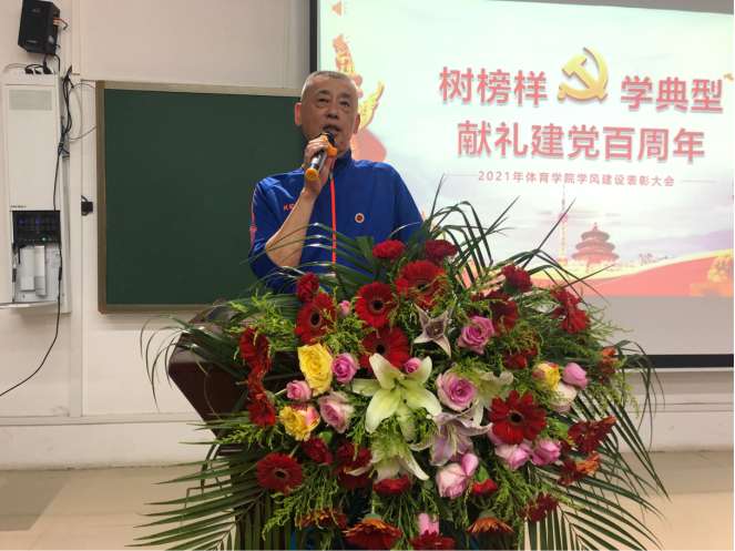 大会在雄壮的国歌声中拉开帷幕。首先由院长刘玉江教授发言。他代表学院全体教职员工向受表彰的先进集体和个人表示热烈祝贺。他指出,2020年是体育学院全体师生不忘初心、牢记使命、奋进拼搏、共谱华章的一年。这一年,体育学院的发展离不开每一位老师及学生的努力,同时希望学院在“树榜样,学典型”的推动下,以先进带动后进,争取学院的更进一步发展。