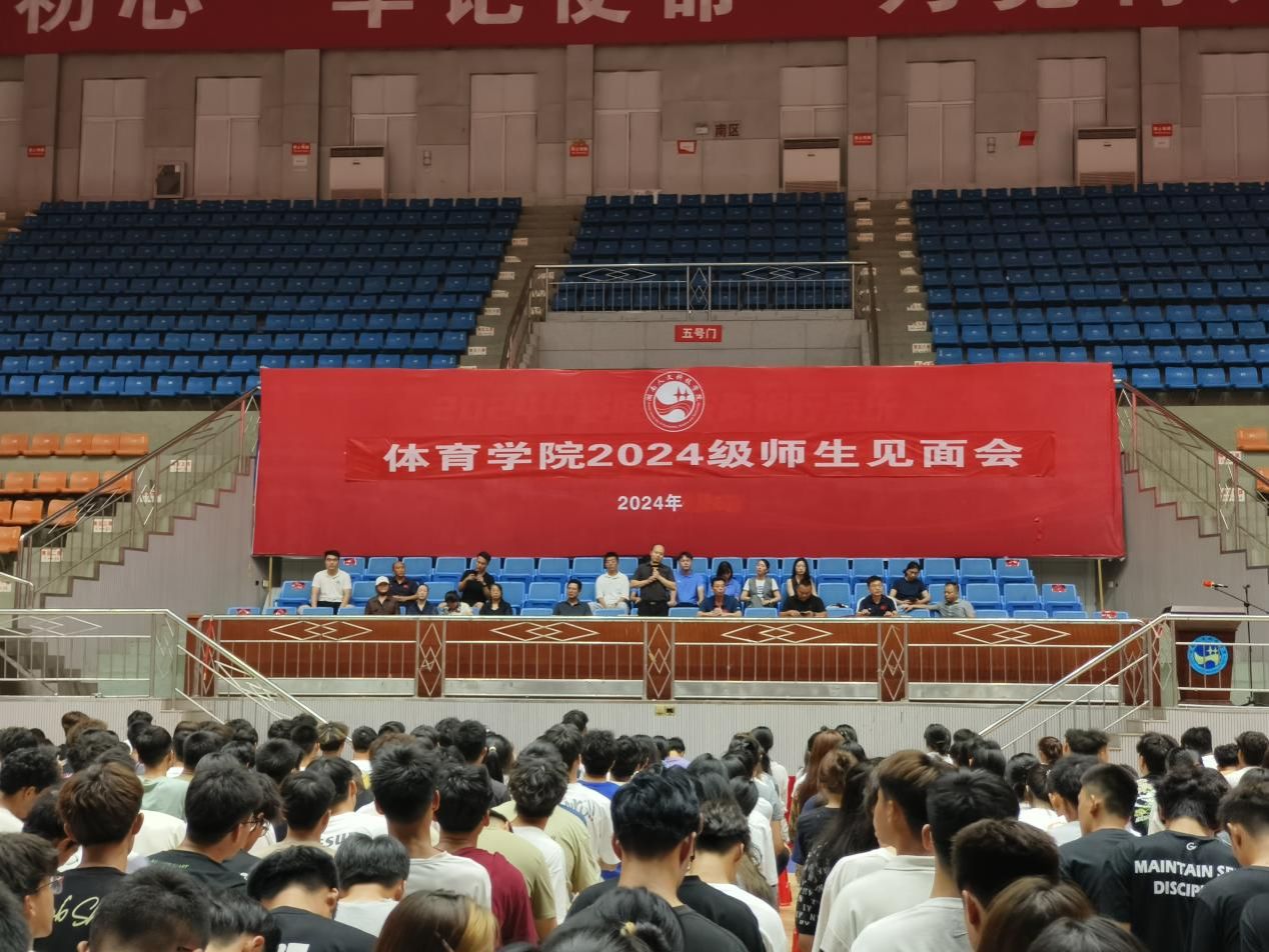 金秋九月,喜迎八方学子。在这金秋送爽、硕果累累的季节里,体育学院迎来了一群朝气蓬勃的2024级新同学。9月14日晚上19:00,体育学院在体育馆召开了“相遇新起点,一起向未来”为主题的新生见面会,开启了一场关于未来与梦想的会面。此次会议体育学院全体党政班子、辅导员、新生班主任、助理班主任出席会议,会议由、学院党总支书记曾黎主持。