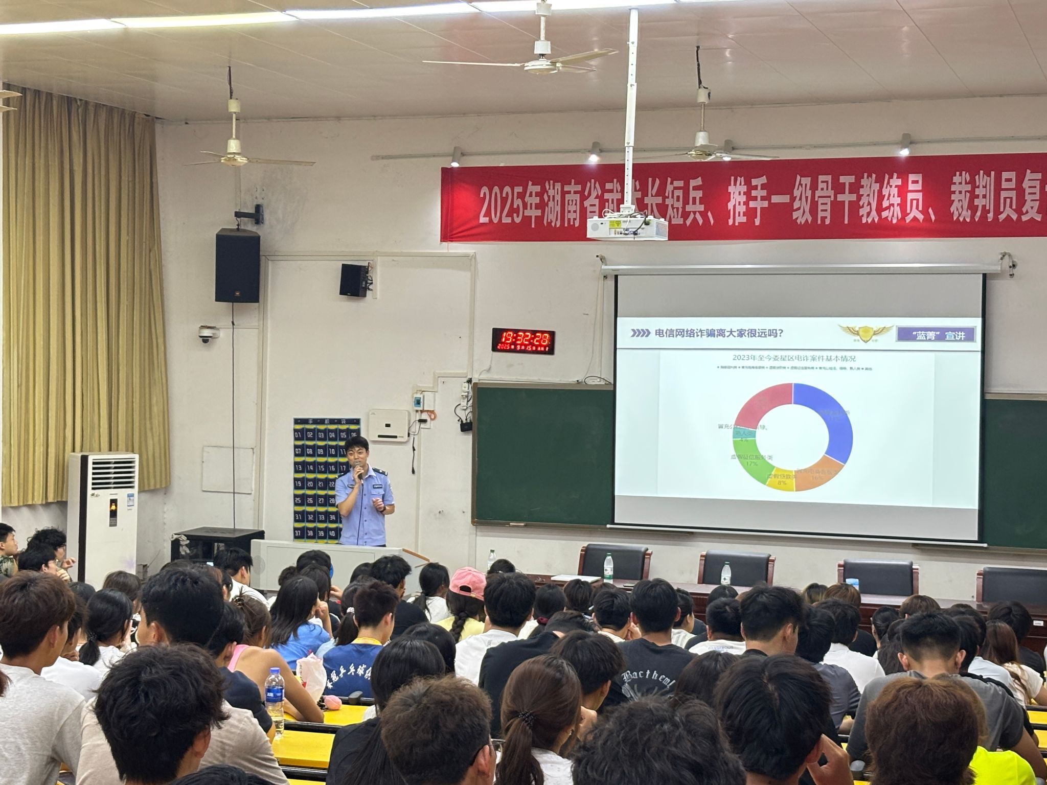 9月15日,晚7:30,体育学院在博达楼115、218教室成功举办2025级新生入学安全教育讲座。本次活动特邀娄底市公安局警官前来授课,旨在增强新生的安全防范意识与自我保护能力。