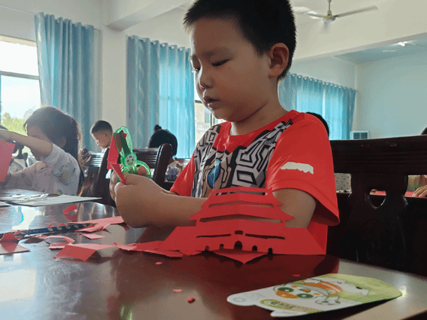 在实践操作环节,孩子们积极地使用剪刀和红色卡纸,在志愿者的悉心指导下,通过折叠、绘图、裁剪等步骤,最终完成了以天安门为主题的剪纸作品。这一过程不仅锻炼了孩子们的动手能力,也加深了他们对爱国主义的理解和感受。