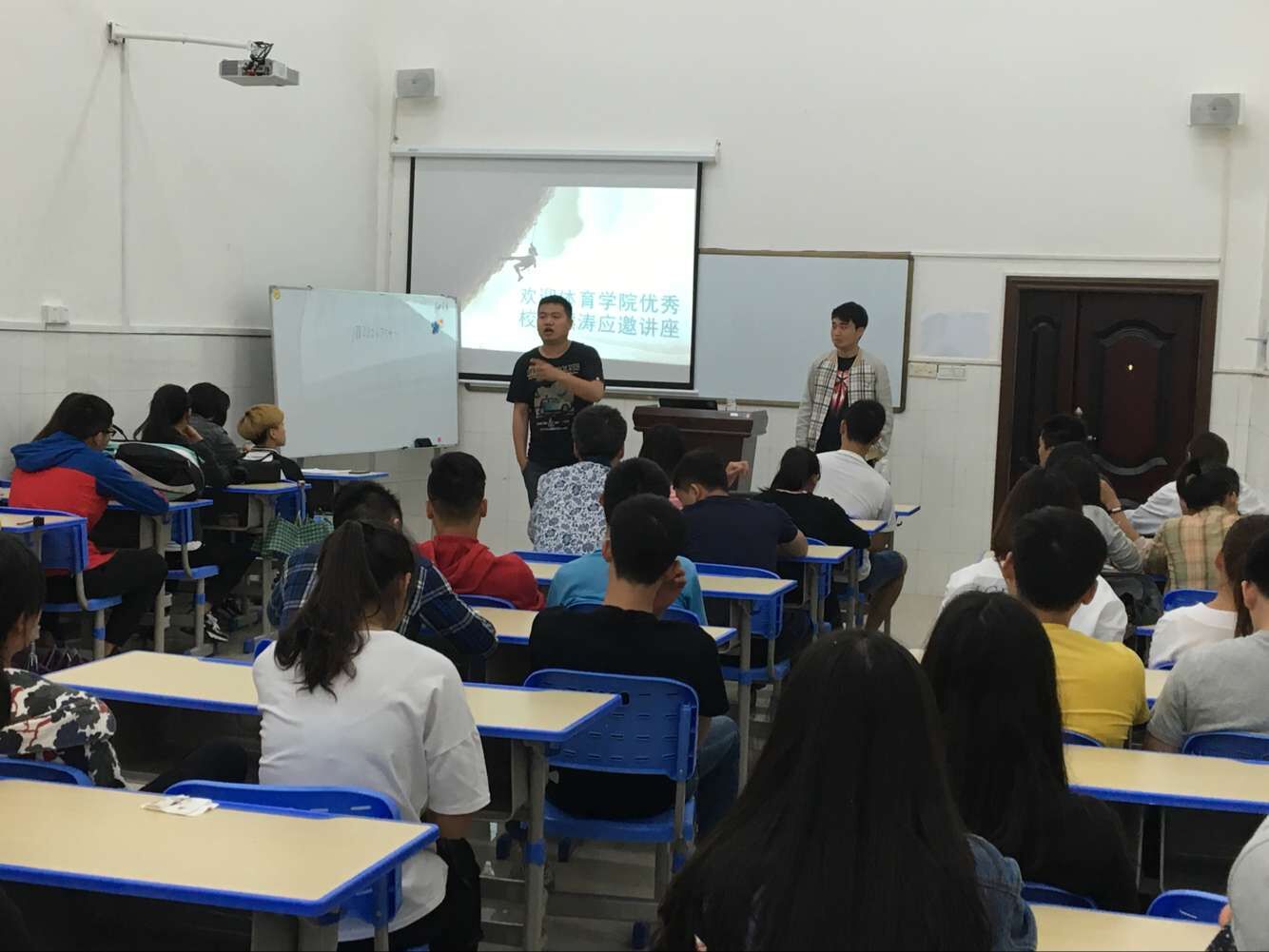 为进一步使我院SYB创业培训班学员明确今后就业创业目标和方向,谢嘉书记和招就专干杨鑫老师特意从深圳惠州请来了优秀创业生——深圳健尔美健身公司创始人熊涛为我院学员们讲座,讲座于5月18日下午五点在我院SYB教室开始,熊涛向学员们讲述了他创业期间艰苦打拼的经历,分享了宝贵的创业成功经验与心得。学员们深受启发,明确了今后创业目标,不断去追求,然后挑战自我,实现自我。