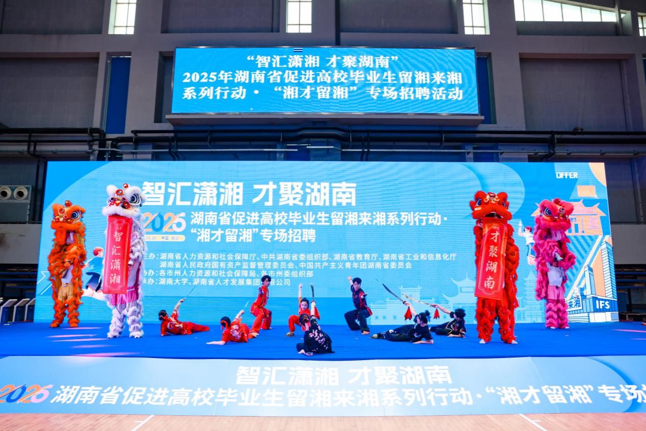 5月10日,“智汇潇湘 才聚湖南”2025年湖南省促进高校毕业生留湘来湘系列行动启动仪式在湖南大学隆重举行。作为受娄底市人社局推荐参演的特色文化名片,贝博体育学院龙狮队、武术队以精湛技艺亮相开幕式,以动感十足的表演展现民族传统体育魅力,为全省青年人才留湘来湘主题活动注入强劲活力。