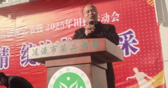周院长盛赞涟源二中素有重视体育的优良传统,体育氛围浓厚、特色鲜明,是名副其实的“体育人才摇篮”,不仅为高校,更为社会输送了大量优秀体育人才。他特别赞扬了以吴萌老师为代表的二中体育教师团队师德高尚、业务精湛,是广大师生学习的榜样。致辞中,周院长对二中学子寄予厚望,鼓励他们不仅在赛场上拼搏争先,更要将“健康第一、终身体育”理念融入日常,努力实现全面发展,成为健康中国建设的积极践行者。同时,他也对正在二中实习的体院学子提出要求,希望他们珍惜机会,虚心求教,全面提升教学、训练及综合育人能力,为未来职业生涯积蓄能量。最后,他预祝全体运动员取得佳绩,运动会圆满成功。