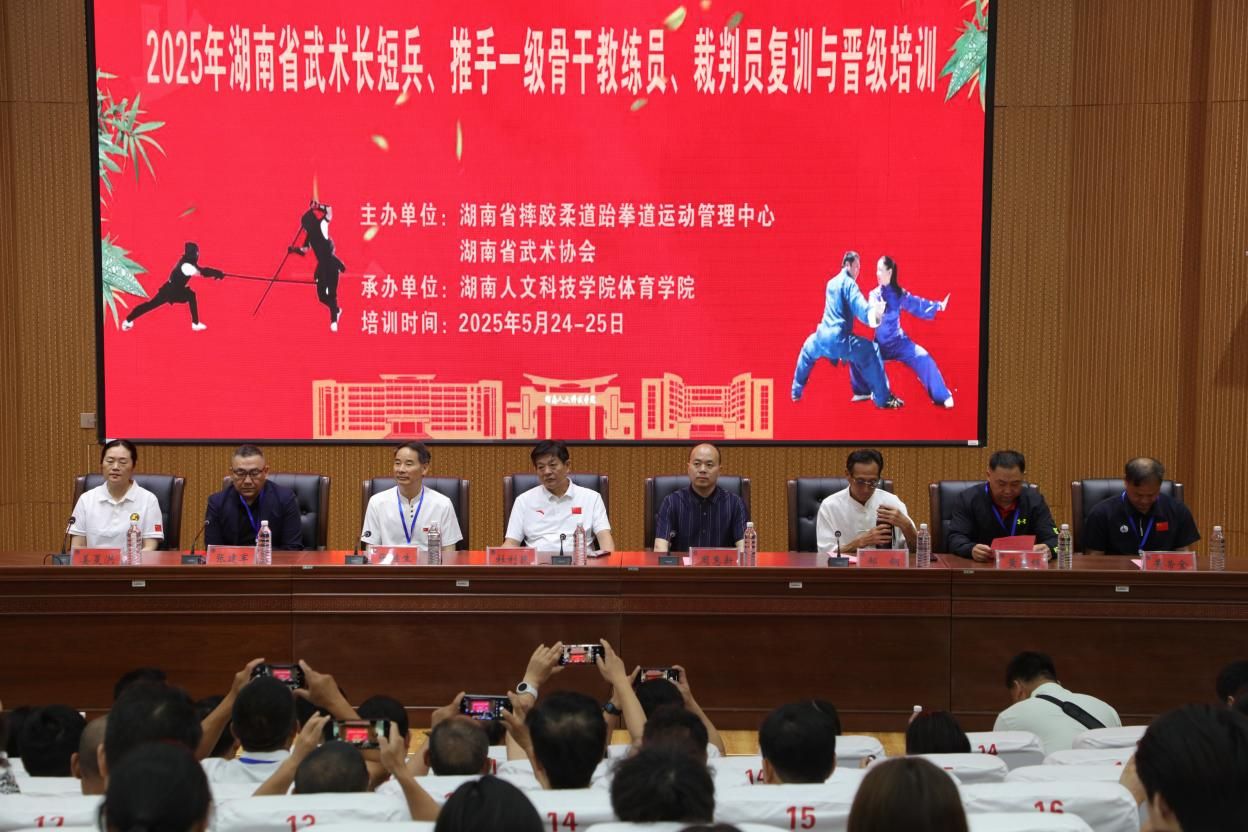5月24日,ballbet贝博bb艾弗森匠成楼报告厅内气氛热烈,2025年湖南省武术协会长短兵、推手一级骨干教练员、裁判员晋级与复训班开班典礼在此举行。来自全省14个市州的75名高级武术教练员、高校教师及武术裁判员齐聚一堂,共同开启为期三天的专业淬炼之旅。此次培训由湖南省武术协会主办,贝博体育学院承办,标志着湘中地区武术人才培养体系迈入新阶段。