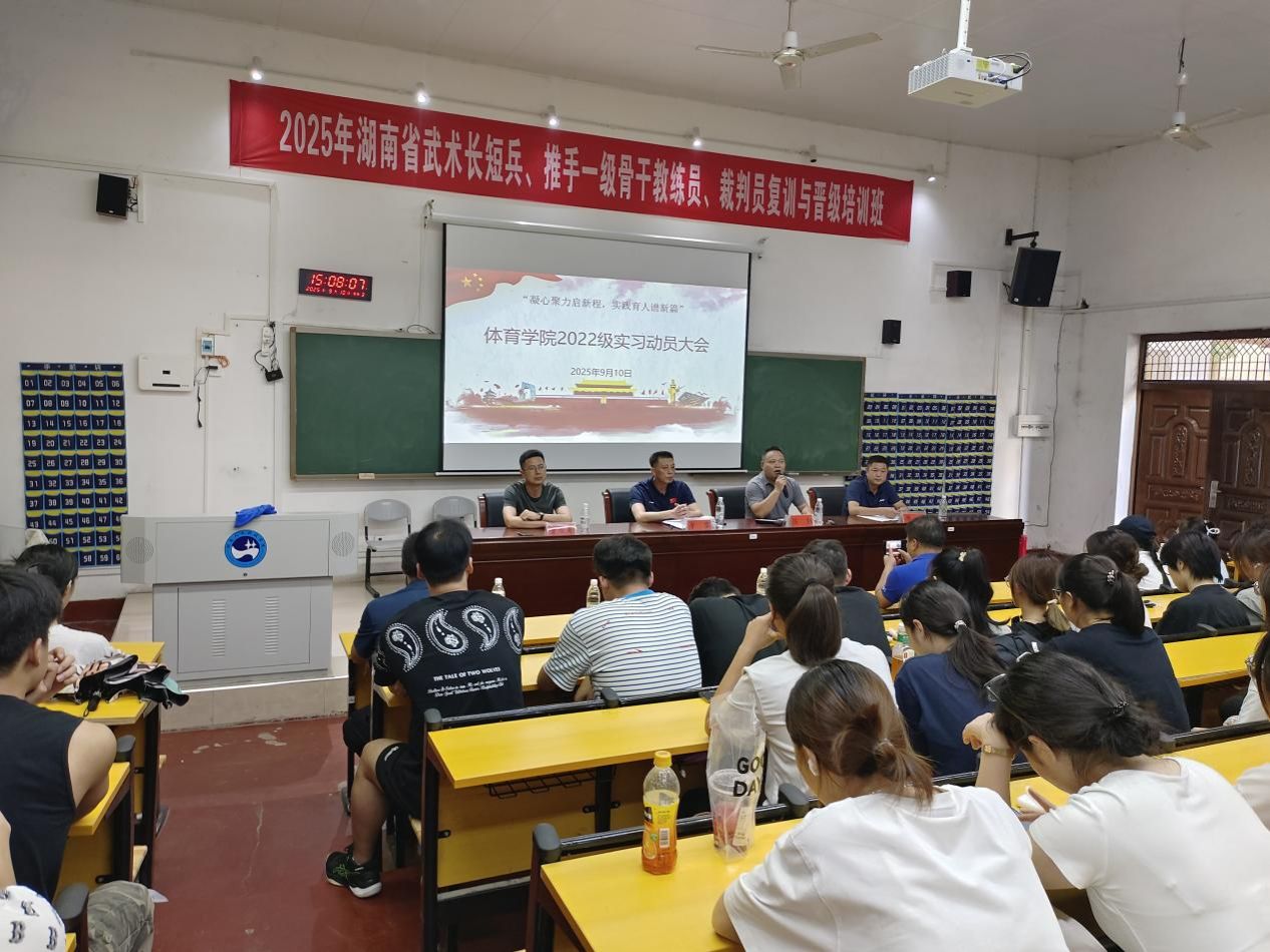 2025年9月10日下午,博达楼115教室内气氛热烈,2022级体育学院教育(专业)实习动员大会在此隆重召开。本次大会以“凝心聚力启新程,实践育人谱新篇”为主题,旨在为即将踏上教育实习征程的学子们凝聚力量、明确方向。体育学院党总支书记曾黎、副院长陈勤、副院长董植寿等领导嘉宾出席,各实习队指导老师及2022级全体学生参加,大会由体育学院实训中心主任杨岭主持。