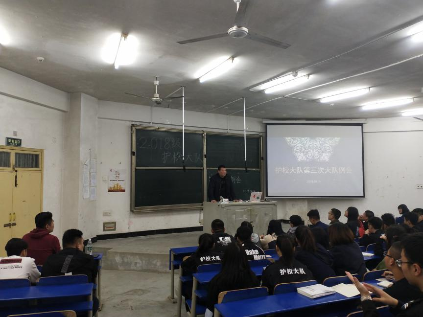 会议伊始,李安祥老师对队员们上学期及本学期近段的工作进行了总结,传达了学校领导和其他部门对护校大队2018年工作的认可,并提出了表扬。接着对护校大队近期的几项重要工作提出了具体要求,1、对学校本科教学审核评估工作方面对队员们做出了严格要求。2、外卖不落地工作的开展。3、学校禁摩工作的开展。最后,提醒队员们学习工作应两不误,以学习为主,在各方面都要努力做到优秀,积极向党组织靠拢。
