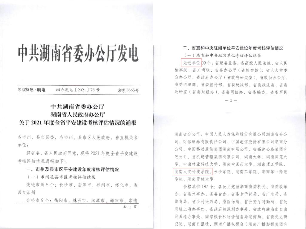 近日,中共湖南省委办公厅、湖南省人民政府办公厅联合下发《关于2021年度全省平安建设考核评估情况的通报》(湘办发电〔2021〕78号),贝博被评为2021年度全省“平安建设先进单位”,全省仅十所本科高校获此殊荣。同时,学校继续获评“平安单位”称号。