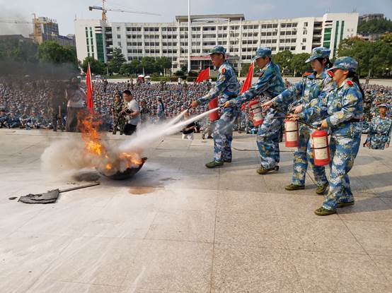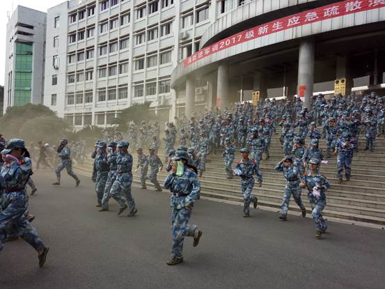 下午3点,随着致远楼消防警报的拉响,应急疏散演练正式开始。楼道间内烟雾熏天,各组工作人员按照事先制定好的演练方案准确到达指定位置,迅速组织学生进入应急疏散状态。在各班军训教官的带领下,全体学生用湿毛巾、衣物等捂住口鼻,按楼层安全员指明的疏散逃生方向紧张而有序的撤离,没有发生任何的挤堵踩踏事件。短短数分钟后,四千余名新生全部撤离到了海园广场并列好队伍,随即观摩娄底市消防支队官兵演示营救火场被困人员的过程。