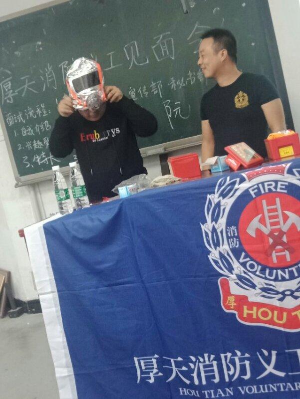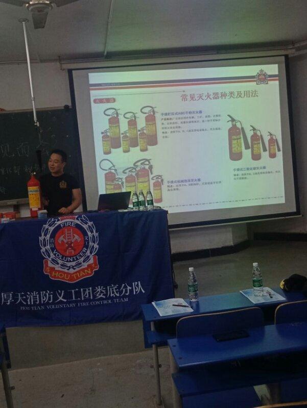 娄底厚天义工团总讲师陈胜分别从消防安全意识、火灾逃离知识、灭火器的使用、防毒面具的使用、逃生绳结的使用、消防精神的学习等方面给新志愿者进行培训。随后介绍了厚天消防义工团的发展历史和所获荣誉。