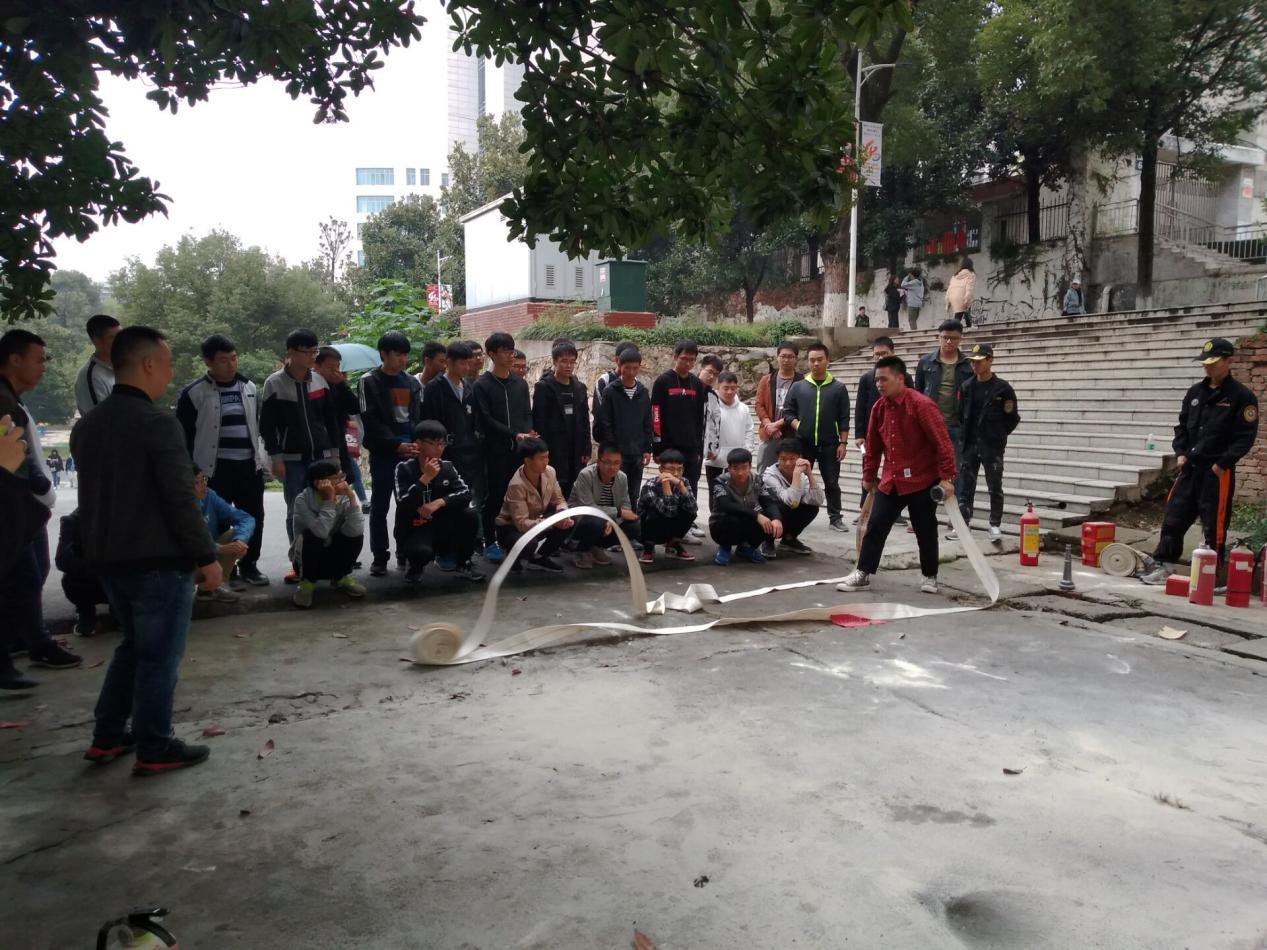 在学而楼室外的空坪上,陈胜老师为大家详细讲解了干粉灭火器、干冰灭火器、过滤式防毒面具、消防水带水枪等消防器材的使用方法以及灭火的正确处理方法。讲解完毕后,大家面对消防器材跃跃欲试,在陈胜老师的指导下,参与培训的全体人员逐一上前对各类消防器材进行了实操。