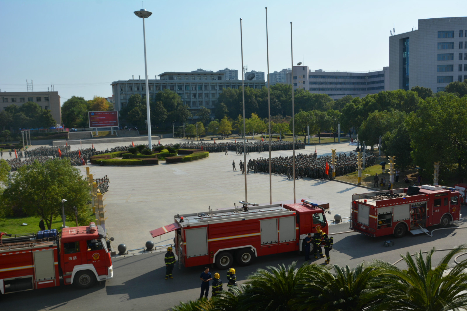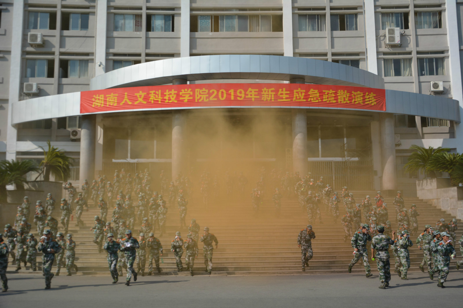 下午3点,致远楼消防警报声骤然响起,滚滚浓烟不断地从教室窗口冒出,应急逃生刻不容缓!保卫处工作人员和厚天消防义工团队员组成的应急疏散小组按照应急预案迅速进入到各楼层指定位置,紧急指挥学生往安全出口方向进行疏散。在各军训教官的带领下,全体新生用湿毛巾、衣物捂住口鼻,低头弓腰、紧张有序地进行撤离,短短几分钟后,4000名新生已经全部撤离至海园广场并列好队伍。随即,娄星区消防救援大队官兵出动3辆消防车,为全体新生演示了使用消防水带水枪灭火的过程。