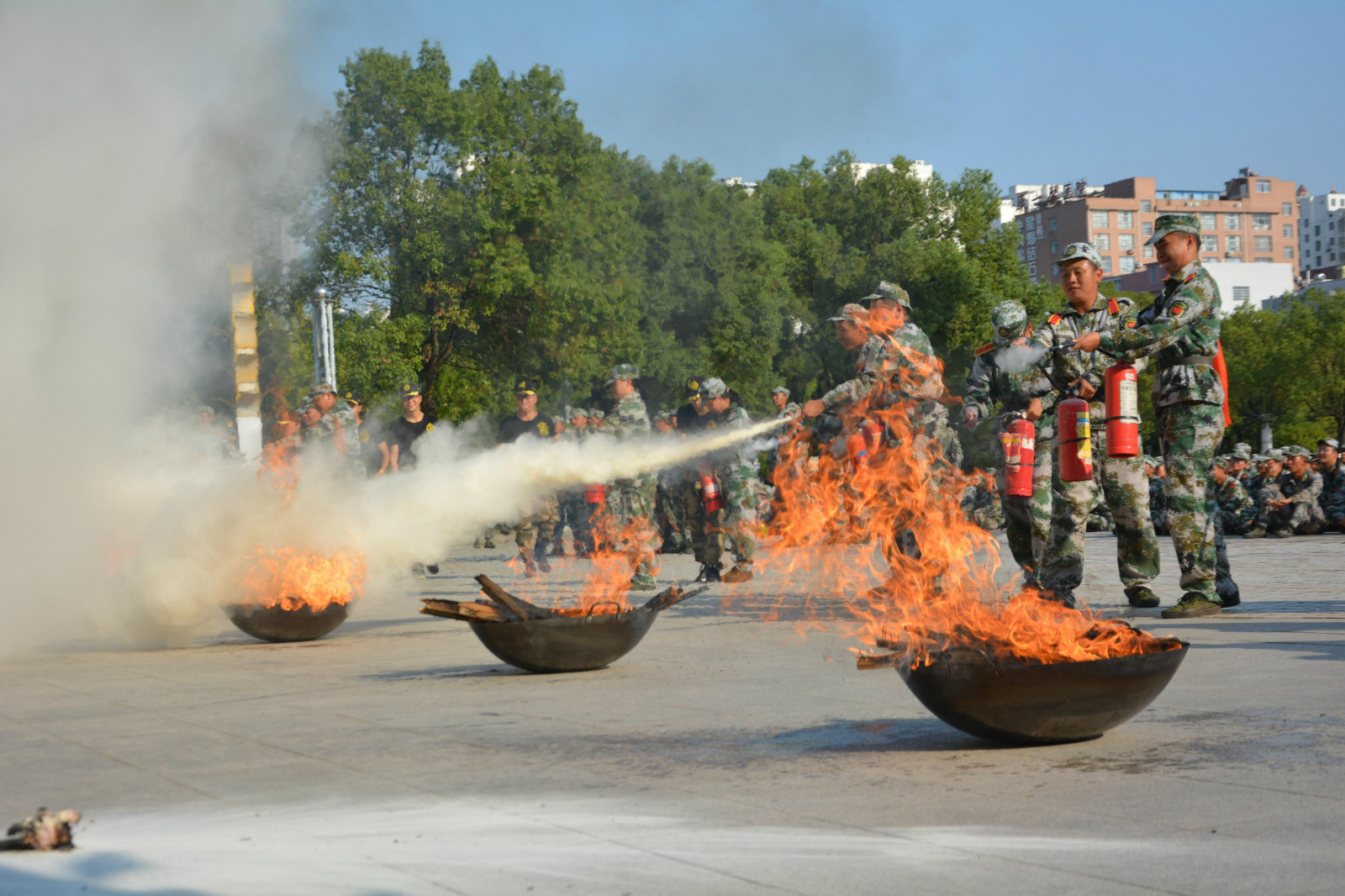 随后,保卫处技防科科长罗朝辉组织各营军训教官和厚天消防义工团队员指导新生如何正确使用干粉灭火器和消防水带水枪并进行灭火演习,现场燃起了六盆火堆,数百名新生依次轮番上前进行灭火器实操。