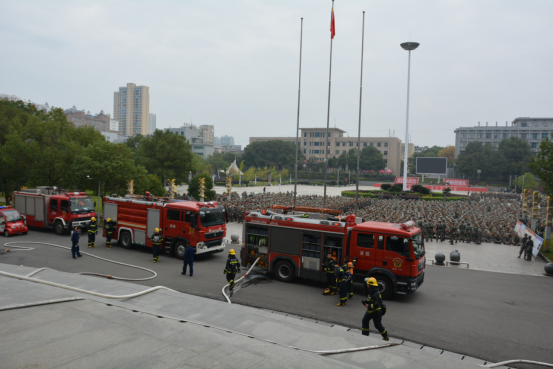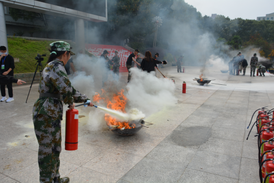 下午1点,致远楼消防警报声骤然响起,滚滚浓烟不断地从教室窗口冒出,应急逃生刻不容缓!保卫处工作人员和厚天消防义工团队员组成的应急疏散小组按照应急预案迅速进入到各楼层指定位置,紧急指挥学生往安全出口方向进行疏散。在各军训教官的带领下,全体新生用湿毛巾、衣物捂住口鼻,低头弓腰、紧张有序地进行撤离,短短几分钟后,4300余名新生已经全部撤离至海园广场。随即,娄星区消防救援大队官兵出动3辆消防车,为全体新生演示了使用消防水带水枪灭火的全过程。现场还燃起了三盆火堆,各连队新生代表依次轮番上前使用灭火器进行灭火实操。