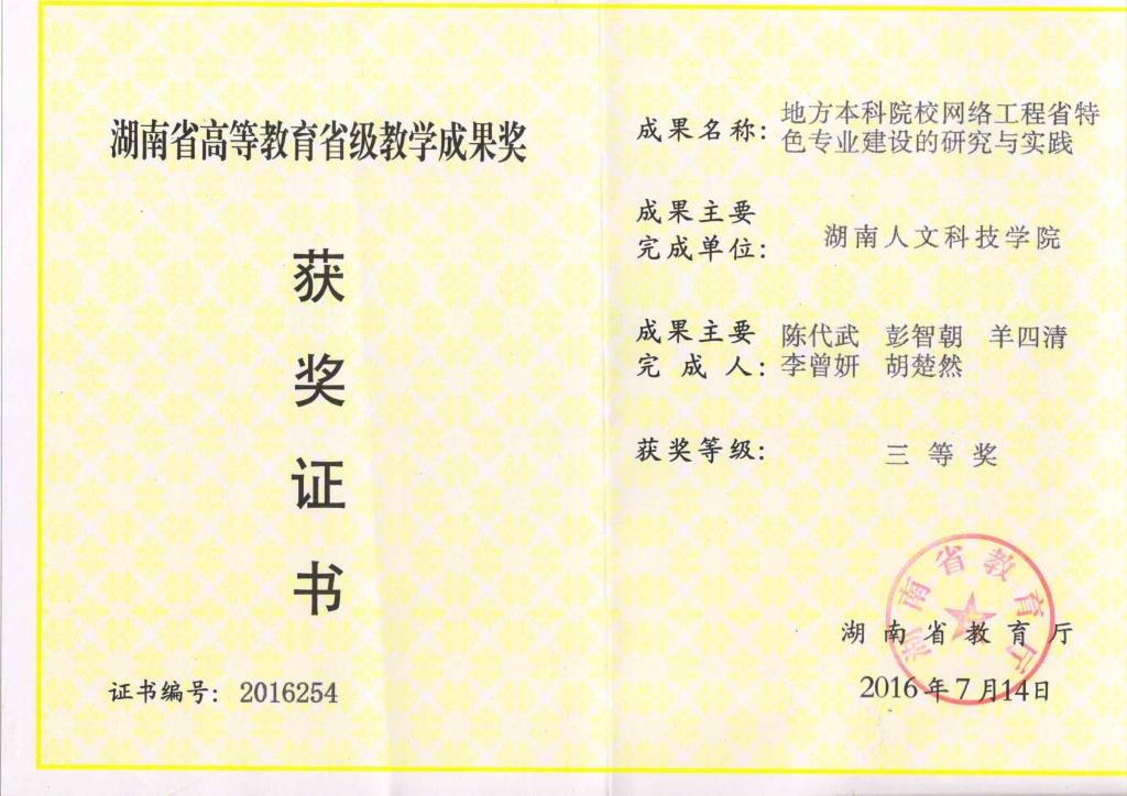 根据《关于开展第十一届湖南省高等教育省级教学成果奖励工作的通知》(湘教通〔2015〕342号)和有关文件精神,经高等学校申报、湖南省教育厅组织专家评审并公示,网络工程专业陈代武副教授等5位同志的项目《地方本科院校网络工程省特色专业建设的研究与实践》,获得了2016年湖南省高等教育省级教学成果奖三等奖。