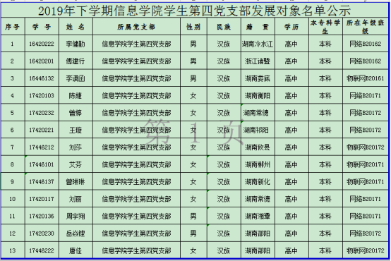 2019年10月23日下午,信息学院学生第四党支部在百全楼101会议室讨论党员发展对象事宜,经支部委员会研究,报上级党总支备案同意,将李健勤等13名同志列为发展对象。根据发展党员工作有关要求,现将其有关情况予以公示(见附表)。