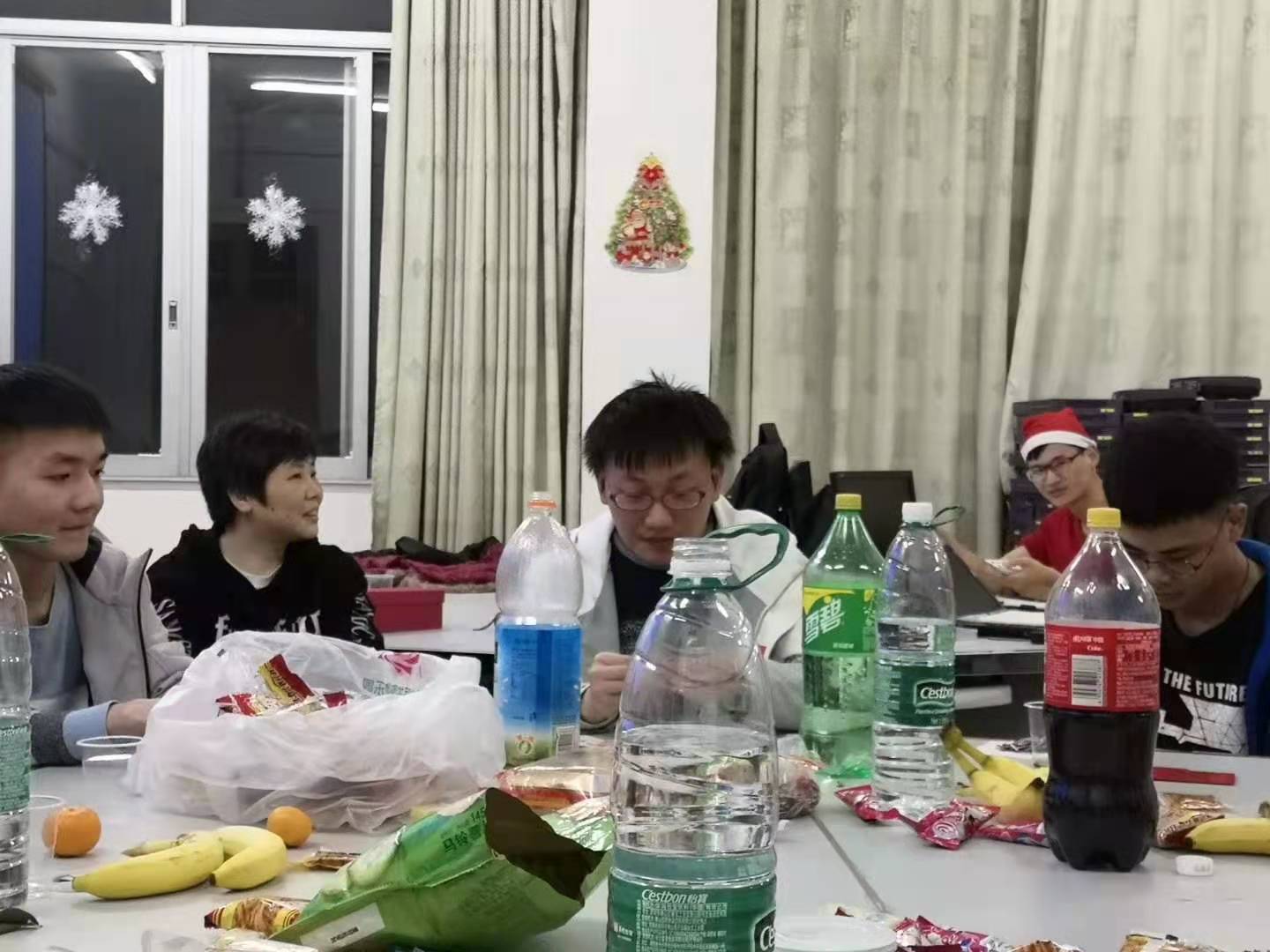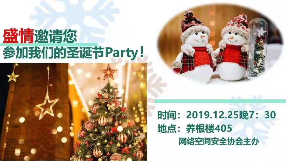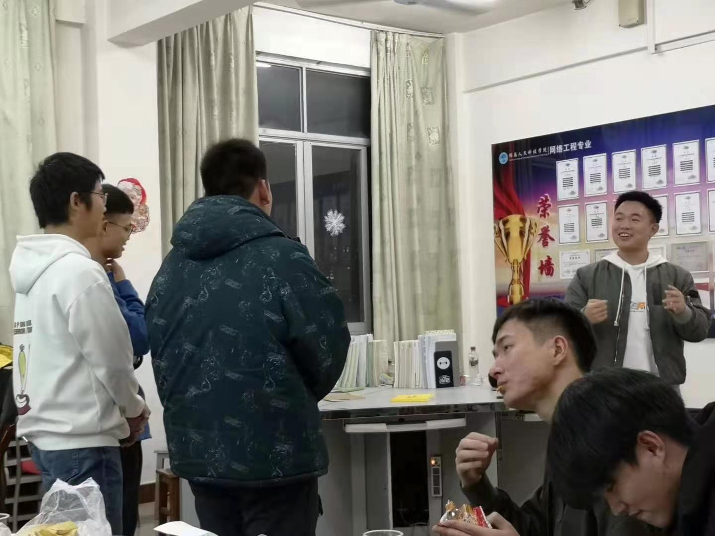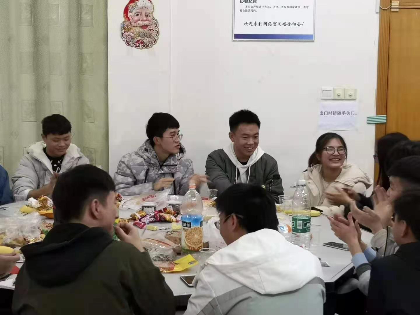 2019年12月25日晚7:30,网络工程专业的学生社团——网络空间安全协会的20多位同学们,在养根楼405举办了圣诞晚会,气氛热烈。此次活动由协会会长唐少雄同学负责组织筹办,网络工程教研室主任李曾妍老师对活动的举办给予了大力支持,与专业教师彭剑老师一起到现场参加了活动。
