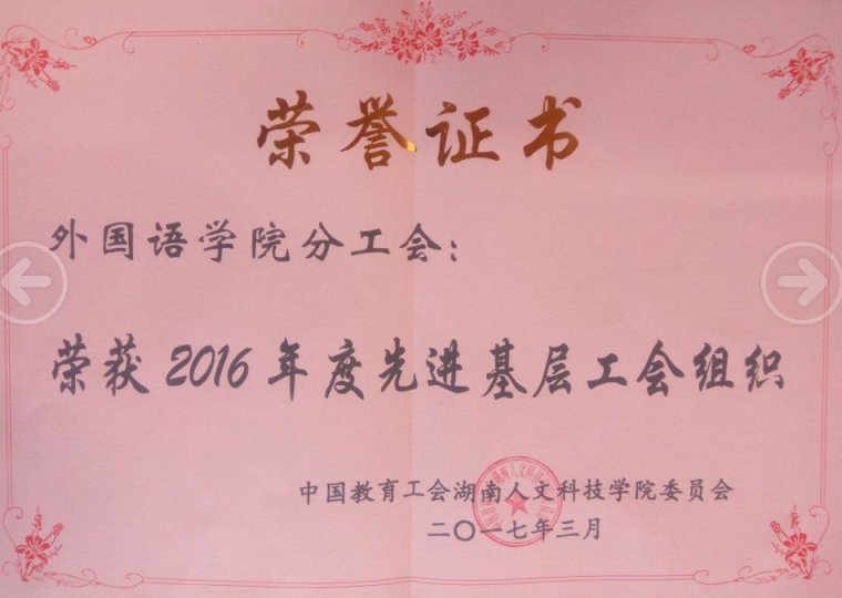 外国语学院分工会荣获贝博2016年度先进基层工会组织