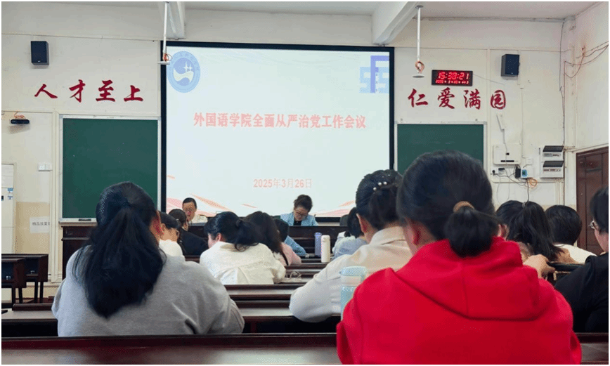 为推进全面从严治党向纵深发展,促进学院事业高质量发展,3月26日,外国语学院在播馨楼406召开全面从严治党工作会议。此次会议由党总支书记李霞主持。全体教师参加会议。