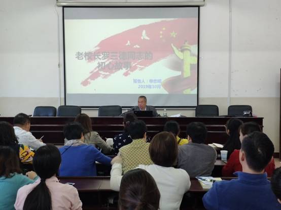 2019108日下午,我院党总支书记申忠明为全体教工党员上党课。主题为“老校长罗三德同志的初心故事”。