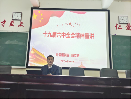 11月16日下午,外国语学院在播馨楼406召开全体教职工会议,传达学习十九届六中全会精神。学院党总支书记阳立新主持会议并做专题宣讲。