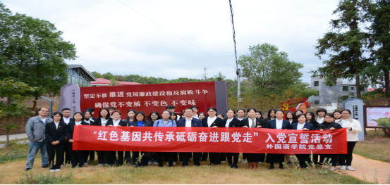 为了喜迎党的二十大胜利召开,提升党员思想意识、筑牢党员政治根基,ballbet贝博bb艾弗森外国语学院党总支于10月8日前往娄底娄星区东冲村苍山居青少年教育实践基地开展入党宣誓活动。院总支委员、支部书记、辅导员及学生预备党员参加了此次活动。