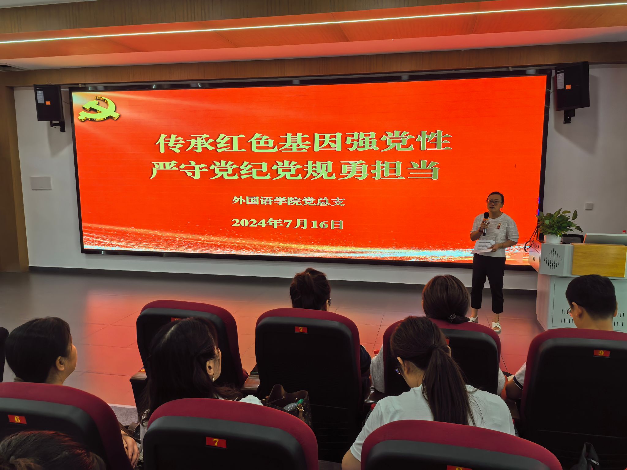 在学习现场,院党总支书记李霞以《传承红色基因强党性 严守党纪党规勇担当》为党员同志们上了一堂精彩的党课。她指出,中国共产党带领无数仁人志士不畏艰险、舍生忘死取得一个又一个的胜利,锻造了以伟大建党精神为源头的中国共产党人精神谱系,是我们的精神瑰宝与力量源泉。我们要善于从历史中汲取养分,赓续红色基因,筑牢信仰之基。她勉励在场党员同志在工作中要用党的创新理论武装头脑,不断提升能力本领;要严守党纪学习教育要求,做到学纪知纪明纪守纪;要勇于担当作为,努力开创外国语学院发展新局面。
