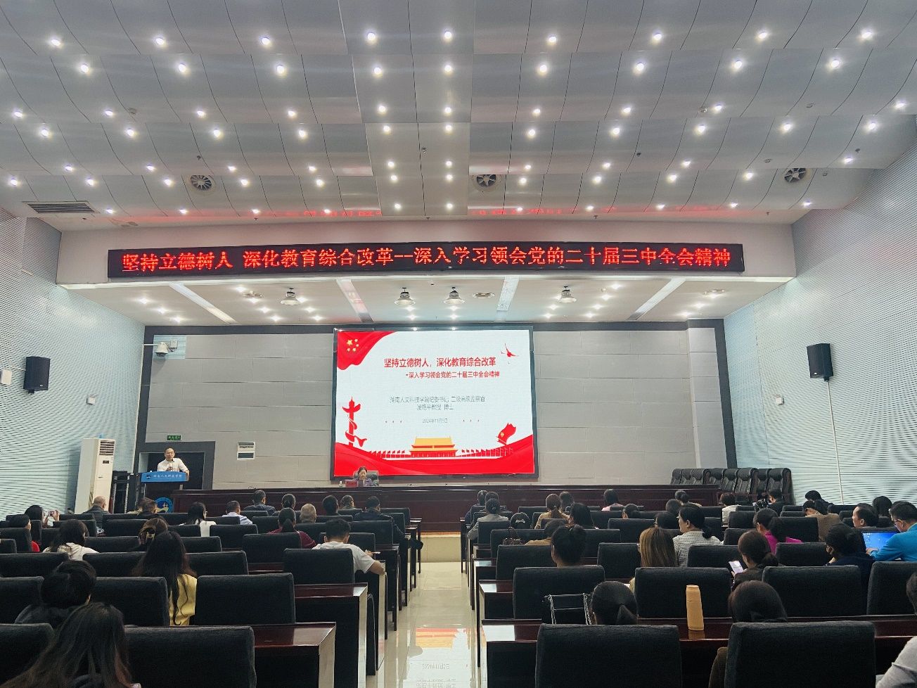 在宣讲报告会上,凌艳平以“坚持立德树人 深化教育综合改革”为题,围绕“党的二十届三中全会精神、《决定》提出的教育综合改革的重大举措、贯彻落实全会精神的基本要求”等三个方面,通过理论阐述、形势分析等方式,对全会精神中关于教育综合改革的重大举措进行了系统宣讲和深入阐释。凌艳平强调,全体师生要深入领会全会中关于教育综合改革的重大举措,结合学校实际,把全会精神贯彻落实到日常教育教学、科研创新、社会服务等各个方面,齐心协力抓好《决定》落实,推动学校高质量发展。宣讲报告解读精准透彻,内容翔实丰富,对学校师生进一步学深悟透、对标落实全会精神具有很强的指导意义。