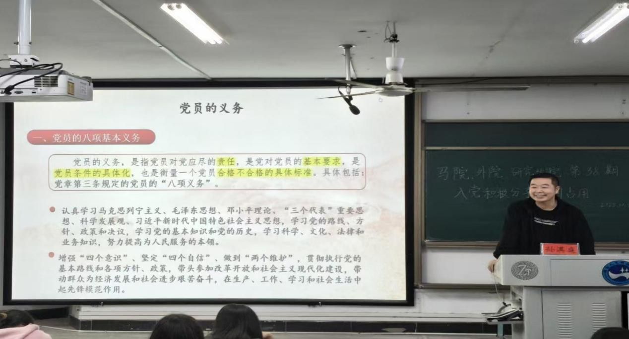 外国语学院党总支副书记罗嗣安以《端正入党动机 争取早日入党》为主题开展了专题党课。罗嗣安紧密围绕“正确的入党动机是入党的首要条件”,通过生动的案例和深入浅出地讲解,引导学员们反思自身入党动机,引导学员要树立献身共产主义事业,全心全意为人民服务的正确入党动机。