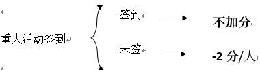 注:不得代签。负责签到人员如发现有代签需将其制止并告知部长,若并未制止且隐瞒此行为-2分/人。若签到后中途退出会场单次扣2分/人。