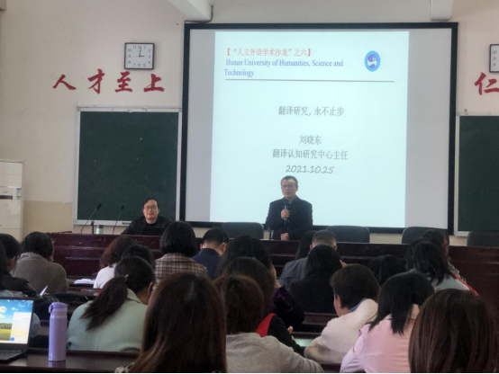 10月25日下午,外国语学院刘晓东博士为本院教师开展主题讲座--“翻译研究,永不止步”,这是继学院科研学术团队成立以来团队负责人开展的第六次学术活动。讲座由外国语学院学术分委员会主任丁志斌教授主持。