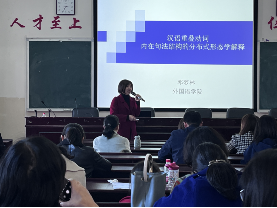 11月19日下午,外国语学院邓梦林博士在播馨楼406开展题为“汉语重叠动词内在句法结构的分布式形态学解释”专题讲座,这是继学院科研学术团队成立以来团队负责人开展的第七次学术活动,讲座由外国语学院学术分委员会主任丁志斌教授主持,外国语学院全体教师参加了此次讲座。