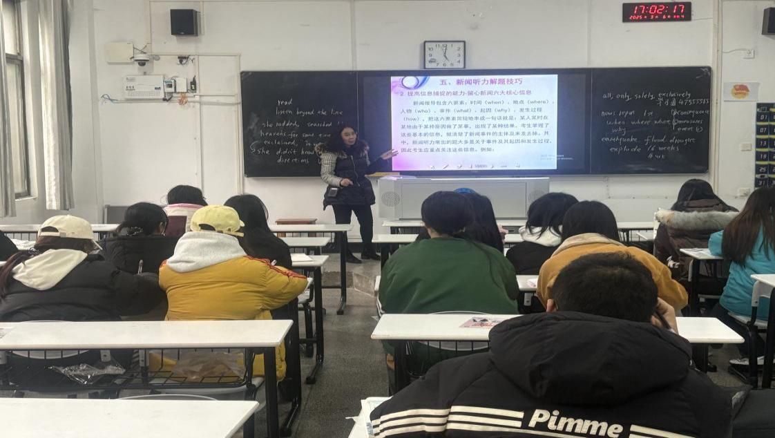 吴新丽老师:课程伊始,吴老师轻点鼠标,借助精心制作的PPT,开启了知识的大门。PPT上,不仅有清晰的文字解析,还有形象的图表和生动的示例,将六级考试中的各种听力题型一一拆解,详细地展现在学生眼前。从短对话到长对话,从短文听力到复合式听写,每一种题型的特点、解题技巧都被剖析得十分透彻。理论讲解过后,便是实战环节。吴老师熟练地操作着多媒体设备,播放起听力真题。学生迅速进入状态,竖起耳朵,全神贯注地聆听着每一个词句,手中的笔不停地记录着关键信息。在这过程中,吴老师也没闲着,她的目光在教室里来回巡视,观察着学生的反应。