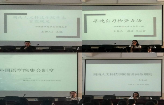 9月12日上午,外国语学院2018级新生校纪校规专题学习讲座在播馨楼406教室举行。学生辅导员曹瑜虹、院学生会副主席王帆、部长彭琼、邓婧、温楚钰、胡丹以及干事李佳丽主持本次培训。