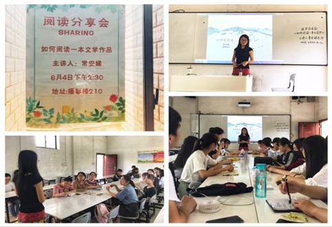 为营造良好阅读氛围,引导学生课外阅读,调动学生的阅读热情,2019 6 4号下午2:30,外国语学院在播馨楼210教室举办了一场读书分享会,邀请常安娣老师为参会的18级学生分享《如何阅读一本文学书》这一经典作品。