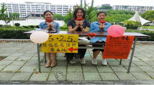 5月25日,外国语学院心理部主办的“5.25”心理健康日活动圆满完成。本次活动包括“与心灵相约,与健康同行”横幅签名活动及“5.25心理健康日”主题海报展览两个板块。活动当天,心理部干部在播馨楼前坪进行摆点宣传“5.25”心理健康知识,同学们积极参与。