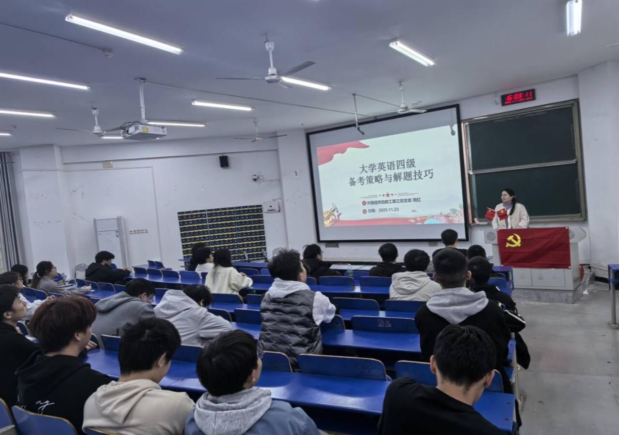 为深入贯彻中央八项规定精神学习教育,充分发挥党员教师先锋模范作用,切实为学生解难题、办实事,2025年11月23日,外国语学院教工第三党支部书记周红老师面向备战大学英语四级考试的同学,开展了一场针对性极强的备考专项辅导讲座。