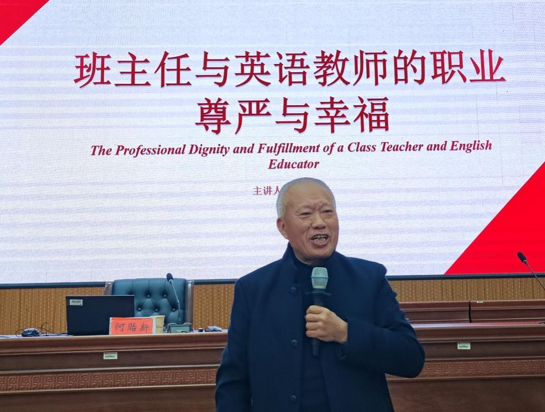 讲座伊始,主持人张点向何贻新老师致以热烈的欢迎,并简要介绍了何老师的从业履历:数十年来,他始终深耕教育一线,在英语教学实践与班级管理工作中沉淀下累累硕果,不仅拥有深厚的专业素养,更积淀了丰富的实践经验;即便退休,他仍余热不减,积极投身各类教学研讨活动与青年教师培养计划,将数十年沉淀的教学心得与班级管理智慧倾囊相授,深受业内同仁与广大学生的尊敬与爱戴。